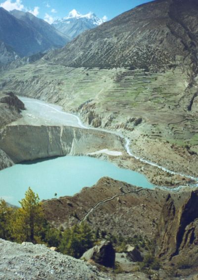 21- D un point de vue (à la limite des arbres sur la photo 9.19) en face de Manang : le lac du glacier Gangapurna et l endroit vers lequel la piste continue.